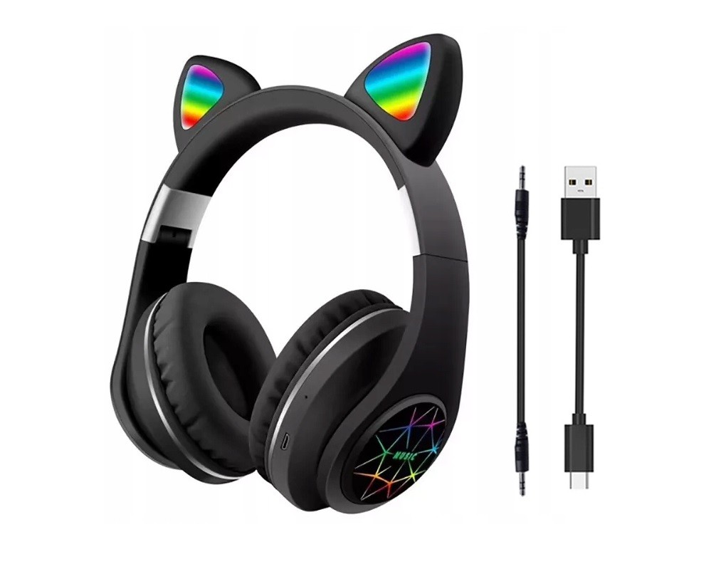 Ασύρματα ακουστικά με αυτάκια γάτας και RGB φωτισμό, σε μαύρο χρώμα.