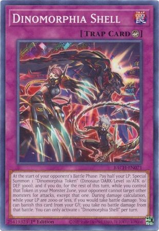 At the start of your opponent's Battle Phase: Pay half your LP; Special Summon 1 "Dinomorphia Token" (Dinosaur/DARK/Level 10/ATK 0/DEF 3000), and if you do, for the rest of this turn, while you control that Token in your Monster Zone, your opponent cannot target other monsters for attacks, except that one. During damage calculation, while your LP are 2000 or less, if you would take battle damage: You can banish this card from your GY; you take no battle damage from that battle. You can only activate 1 "Dinomorphia Shell" per turn.