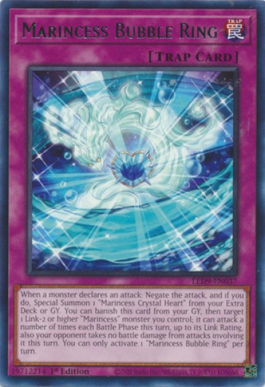 When a monster declares an attack: Negate the attack, and if you do, Special Summon 1 "Marincess Crystal Heart" from your Extra Deck or GY. You can banish this card from your GY, then target 1 Link-2 or higher "Marincess" monster you control; it can attack a number of times each Battle Phase this turn, up to its Link Rating, also your opponent takes no battle damage from attacks involving it this turn. You can only activate 1 "Marincess Bubble Ring" per turn.