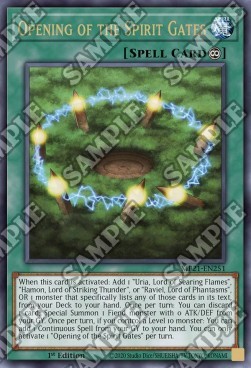 When this card is activated: Add 1 "Uria, Lord of Searing Flames", "Hamon, Lord of Striking Thunder", or "Raviel, Lord of Phantasms", OR 1 monster that specifically lists any of those cards in its text, from your Deck to your hand. Once per turn: You can discard 1 card; Special Summon 1 Fiend monster with 0 ATK/DEF from your GY. Once per turn, if you control a Level 10 monster: You can add 1 Continuous Spell from your GY to your hand. You can only activate 1 "Opening of the Spirit Gates" per turn.